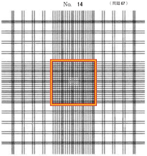 67. 血小板数をBrecher-Cronkite法にて目視した. 用いた計算板 ( Burker-Turk ) の区画を示す. 100倍に希釈した血液を用いた図中オレンジ色枠内の任意の5つの中区画のカウントは ( 14 , 16 , 13 , 12 , 15 ) であった.