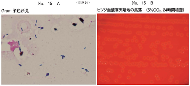 74. 血液培養にて検出された菌のGram染色所見とヒツジ血液寒天培地の集落を示す. 本菌はCAMPテストおよび馬尿酸塩加水分解試験が陽性であった.