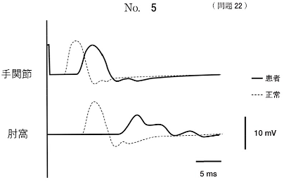- 手関節と肘窩で脱髄を示唆する伝導速度低下や時間的分散および遠位潜時の延長を認め , 慢性炎症性脱髄性多発根神経炎の所見を呈する