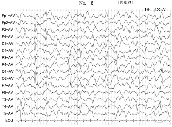 - 振幅が多様な高振幅除波と棘波が無秩序に出現しておりヒプスアリスミアの所見である