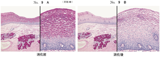 食道のPAS染色標本Aとα-アミラーゼ消化後のPAS染色標本Bを示す. 消化試験で同定されるのはどれか.