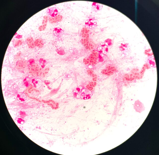 培養からはムコイド型の緑膿菌が検出されました。患者の気道内にバイオフィルムを形成した緑膿菌は粘性物質で菌体を包んで定着し、塗抹ではカエルの卵状に見え、培養ではM型集落が検出されます。